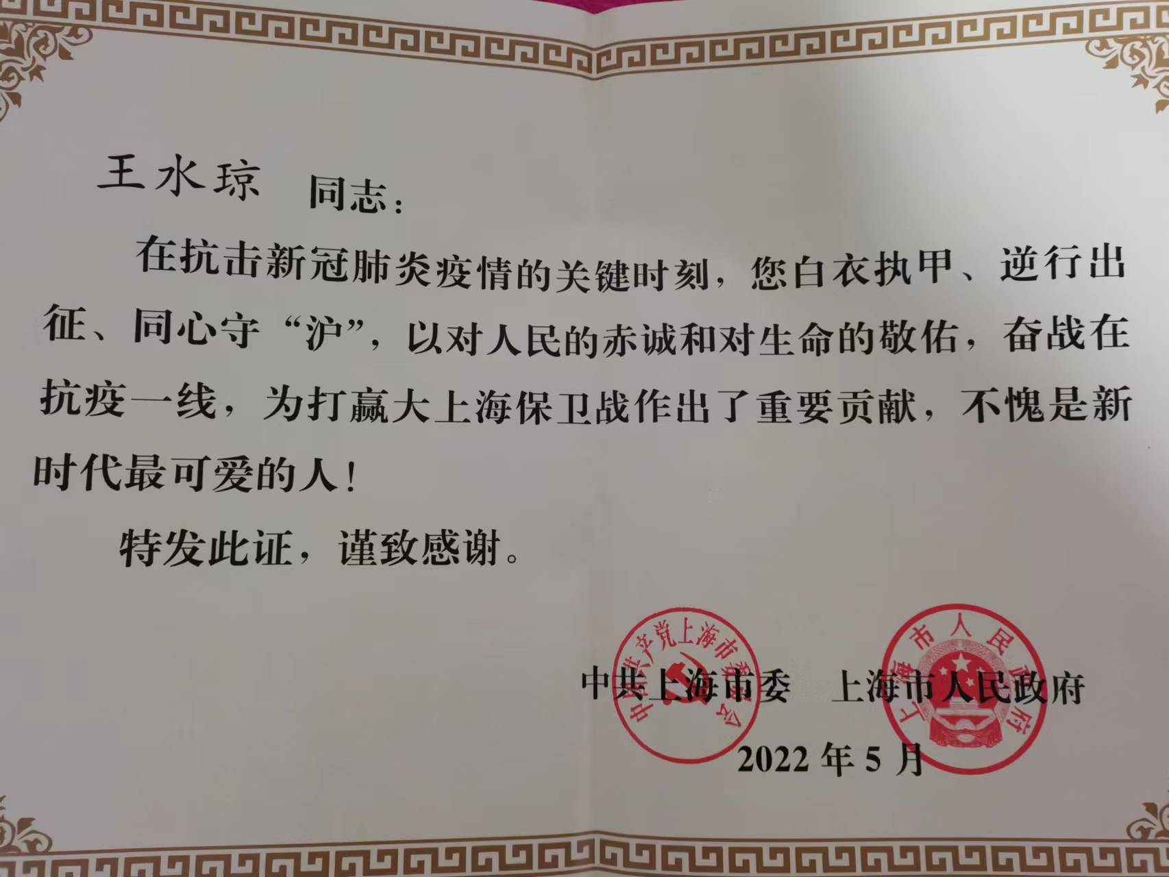 在抗击新冠肺炎疫情的关键时刻,我院检验科王水琼白衣执甲、逆行出征、同心守“沪”,以对人民的赤诚和对生命的敬佑,奋战在抗疫一线,为打赢大上海保卫战作出了重要贡献,不愧是新时代最可爱的人!